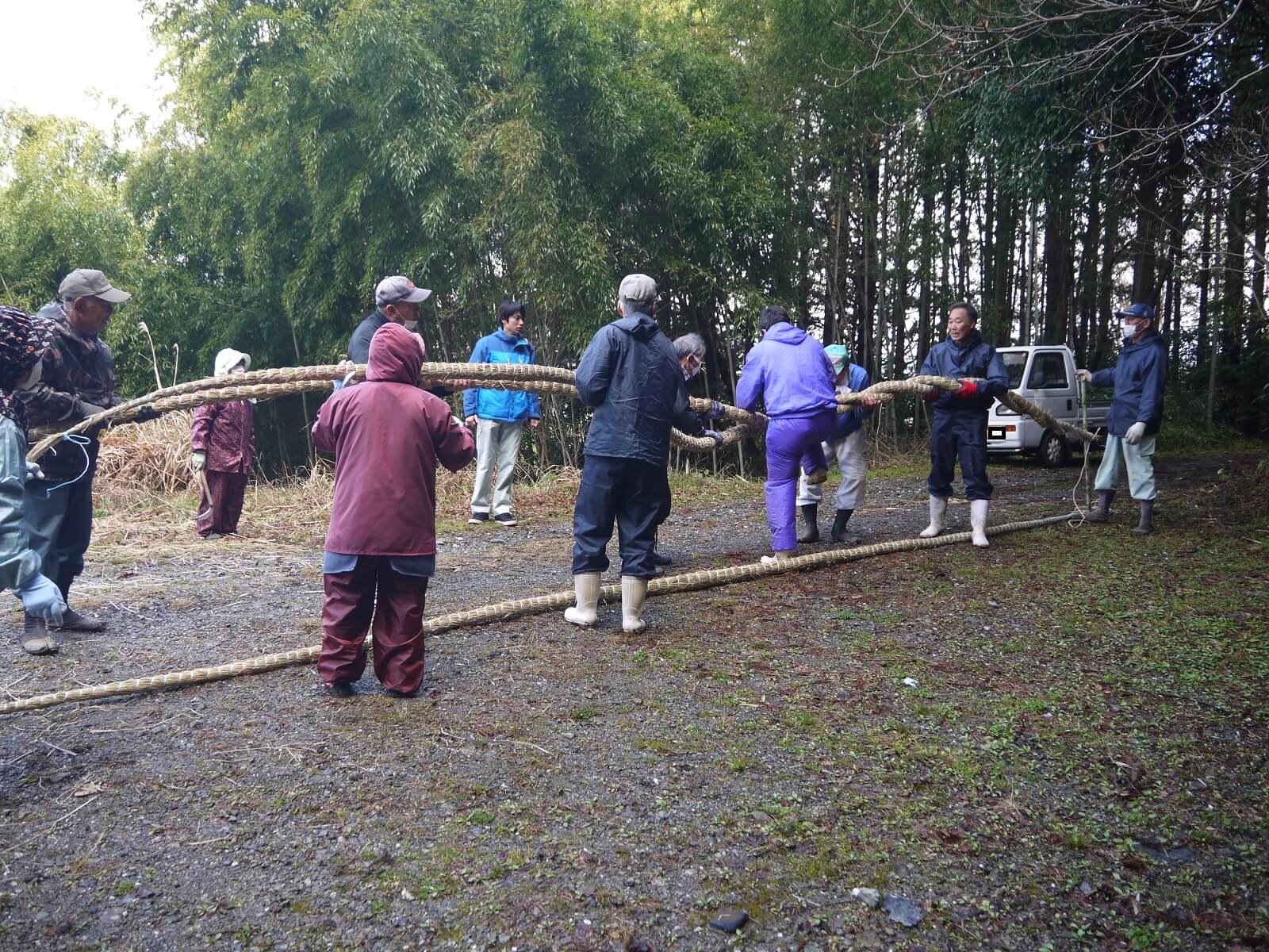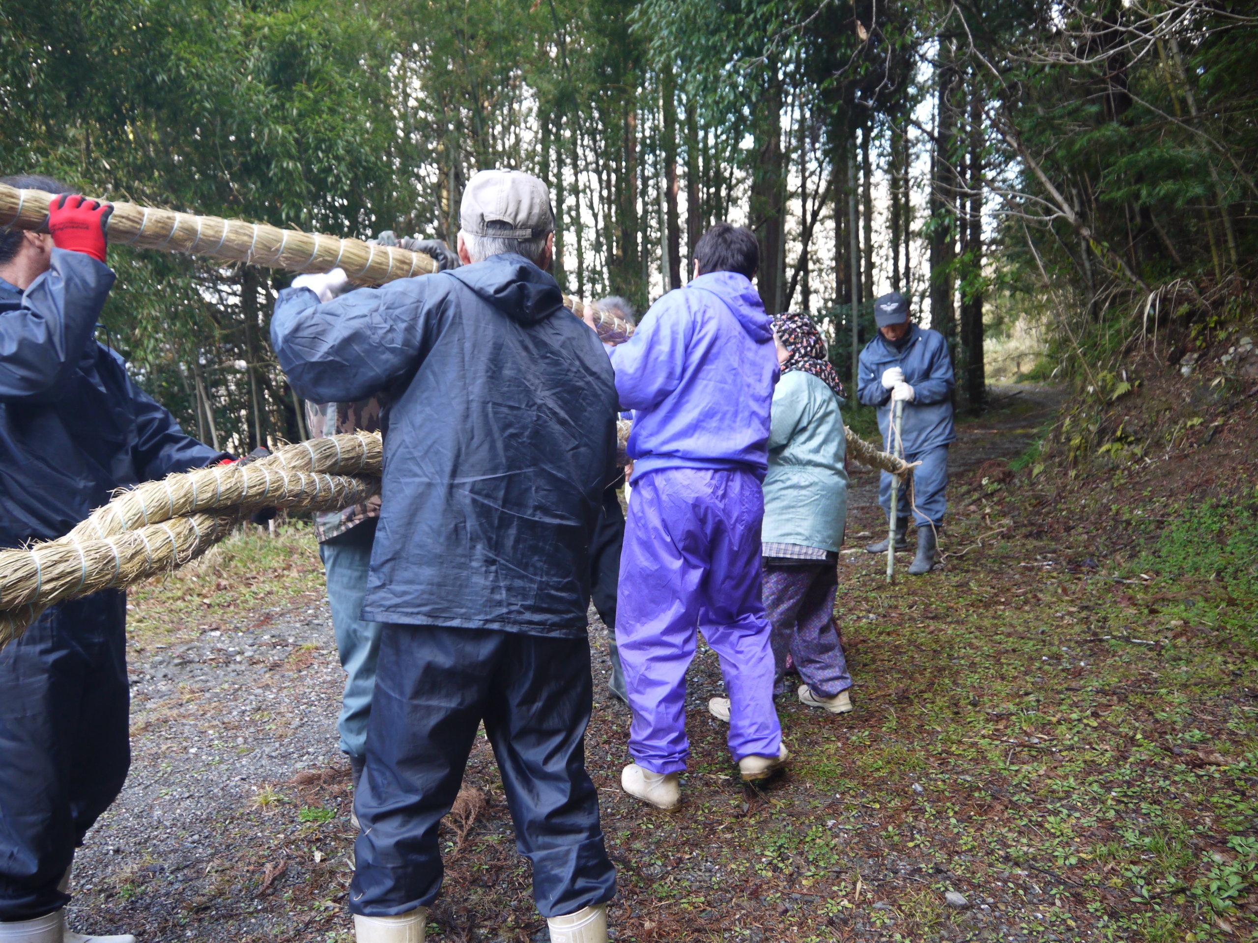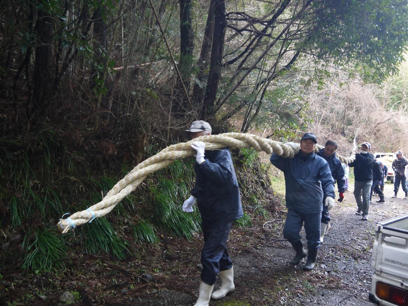 重い縄を大勢で支えます
