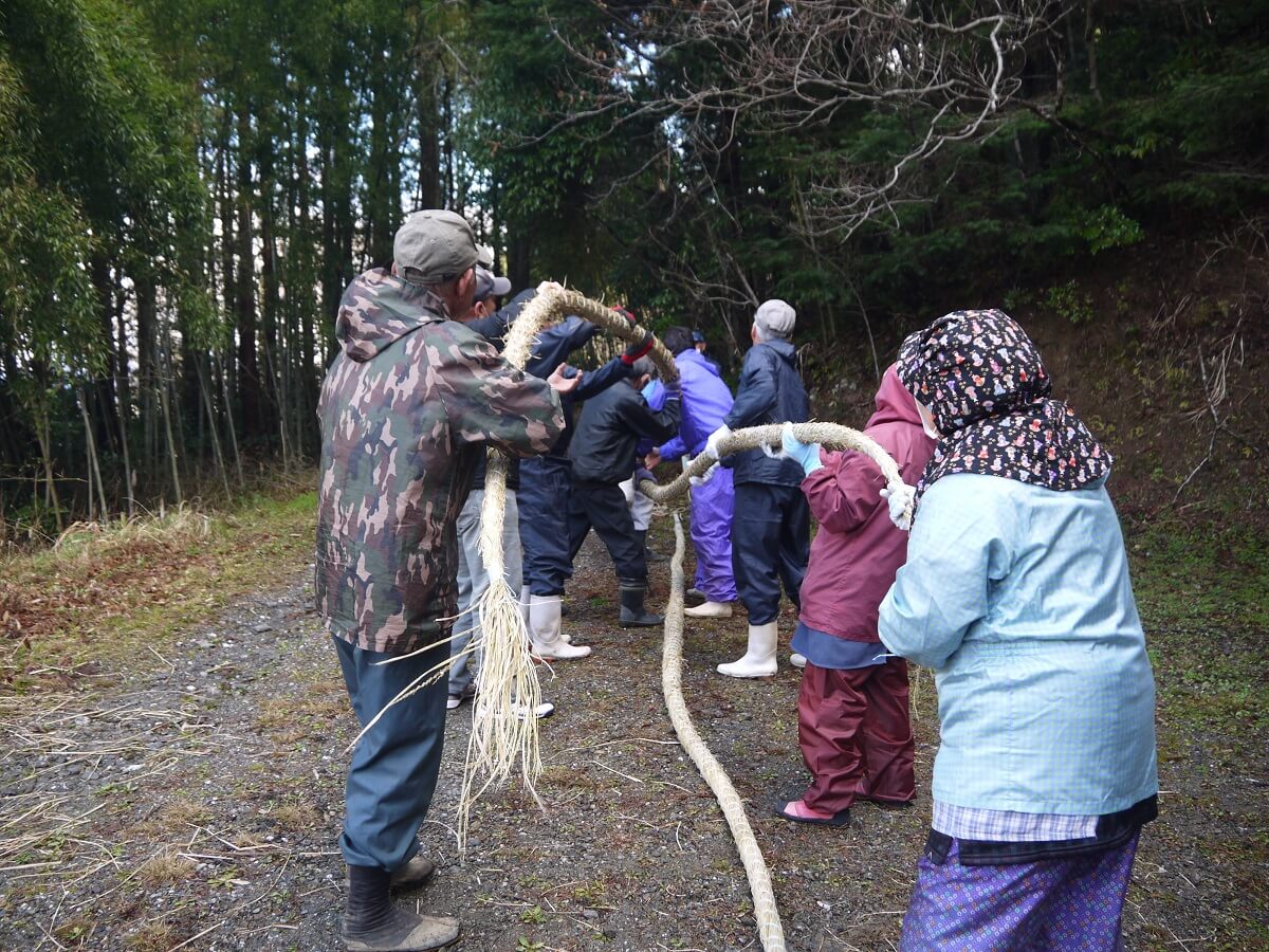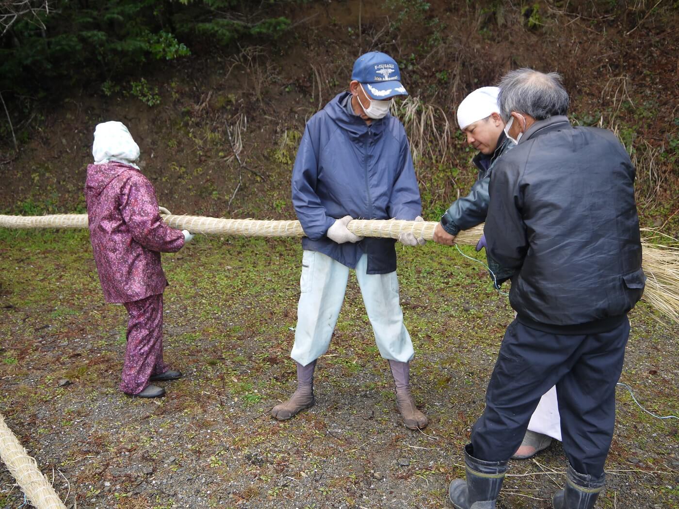 完成したしめ縄をひょうたん桜のもとへ運びます