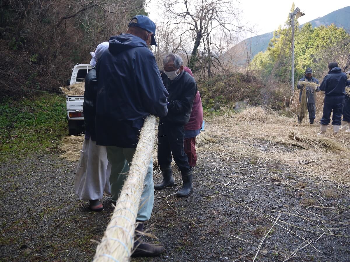 長さ8mに仕上げますが、しめ縄の中央部分が一番太くなるように藁を継いでいきます