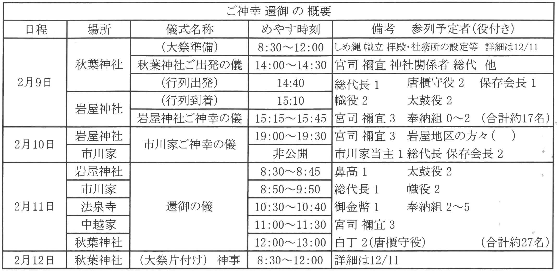 それに伴い神輿付き役やお供役の多くを省略する。神楽の奉納 巫女による舞奉納も省略する。