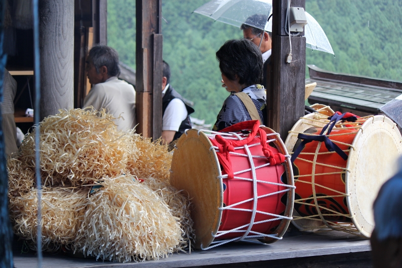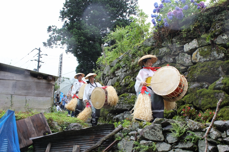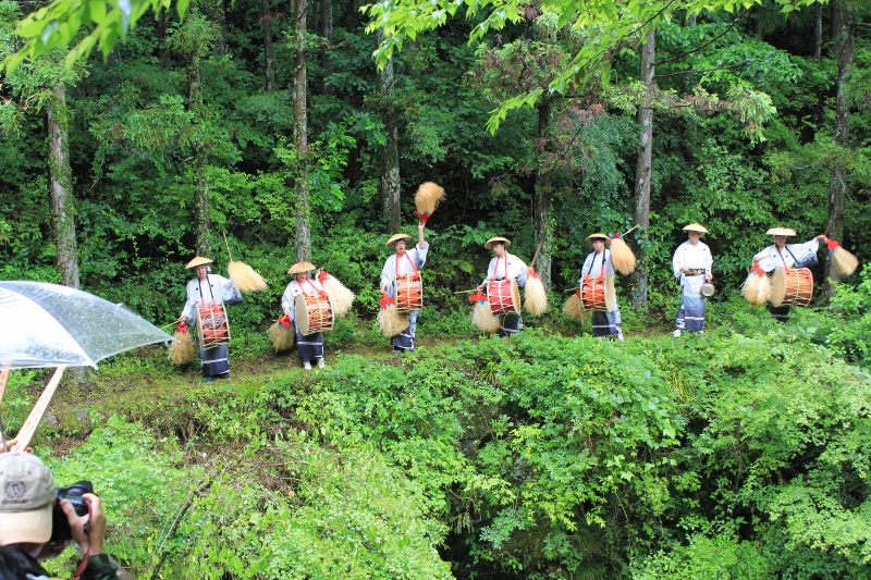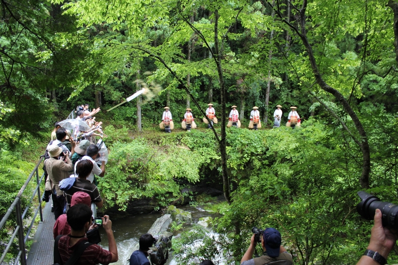 お堂で奉納の踊りが終わった後、太鼓踊りの一行と地区の人々が歌を歌いながら地区内を練り歩き、はるか下方にある山間の川へと向かいます。川に着くと、奉納の踊りと、祭りの道具類を自然に返す川流しが行われます。