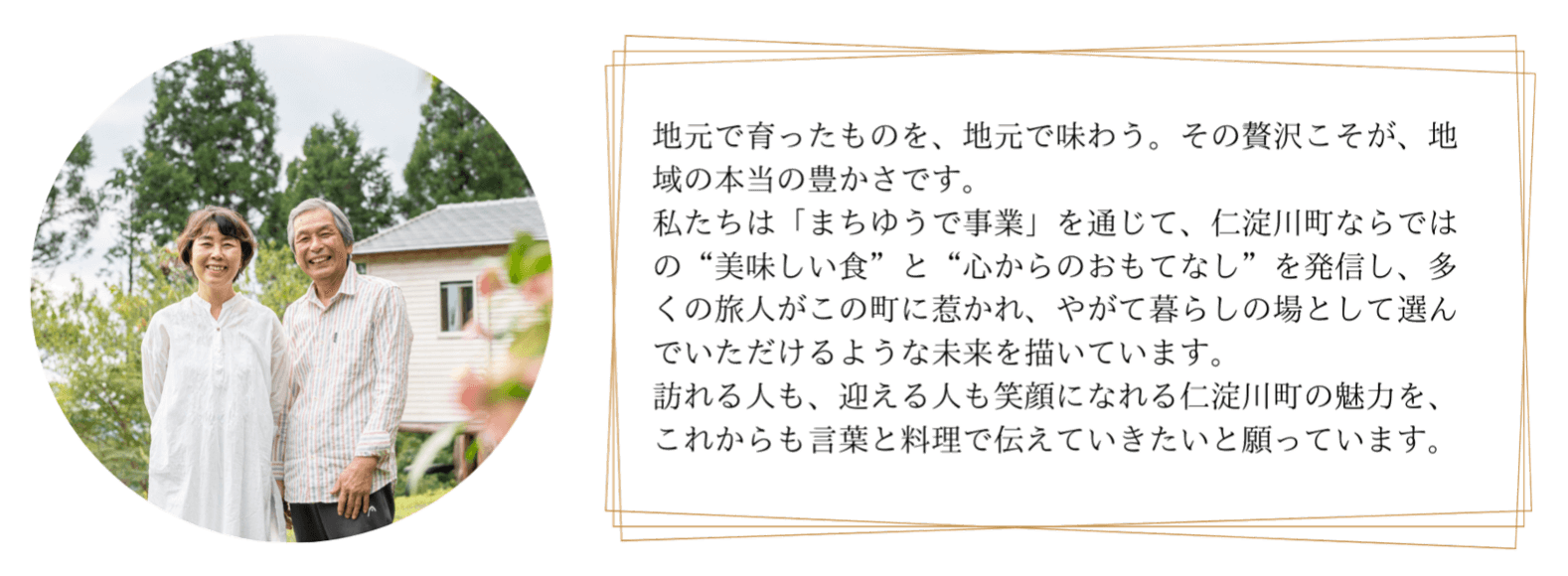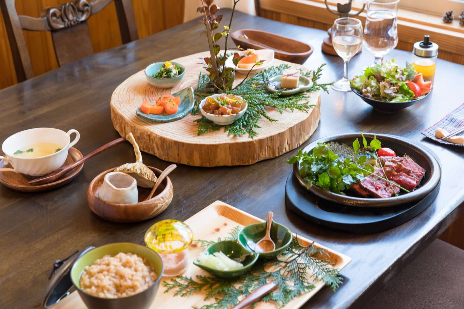 土佐あか牛の本来の肉の美味しさが伝わるサーロインステーキ”と “地元の太陽を浴びた味の濃い自家栽培野菜、ハーブ、野草”をたっぷりと使ったコース料理。仁淀川町の恵みを五感で楽しんでいただけます。