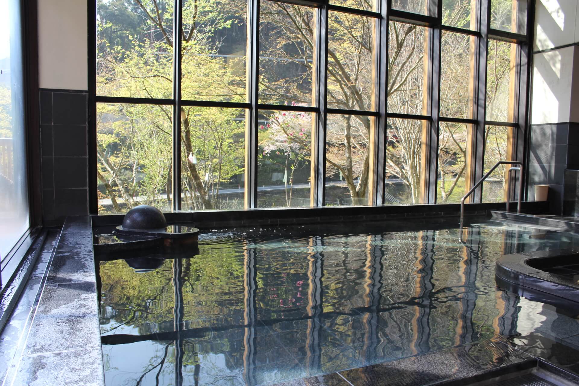 ゆの森の温泉はこの開放的な川沿いのお風呂と山手のお風呂が一週間ごとに男湯・女湯と入れ替わります