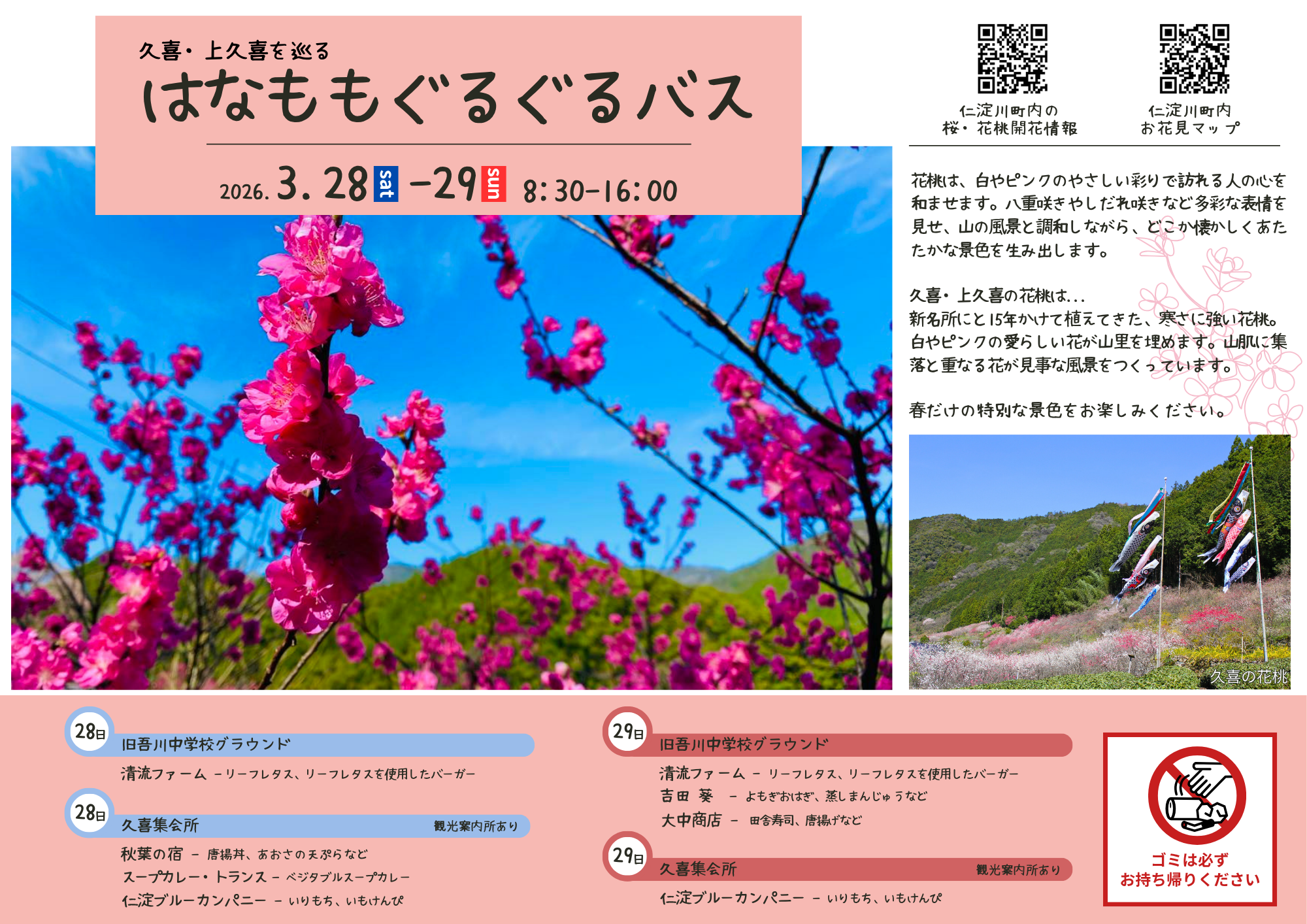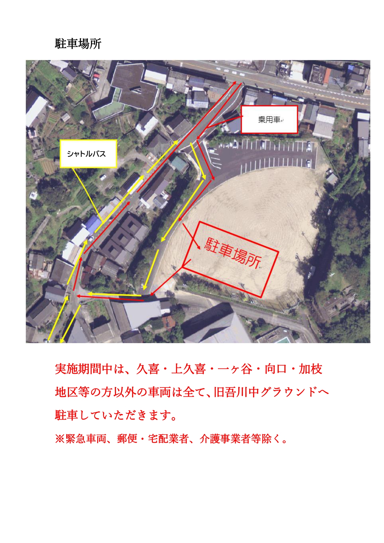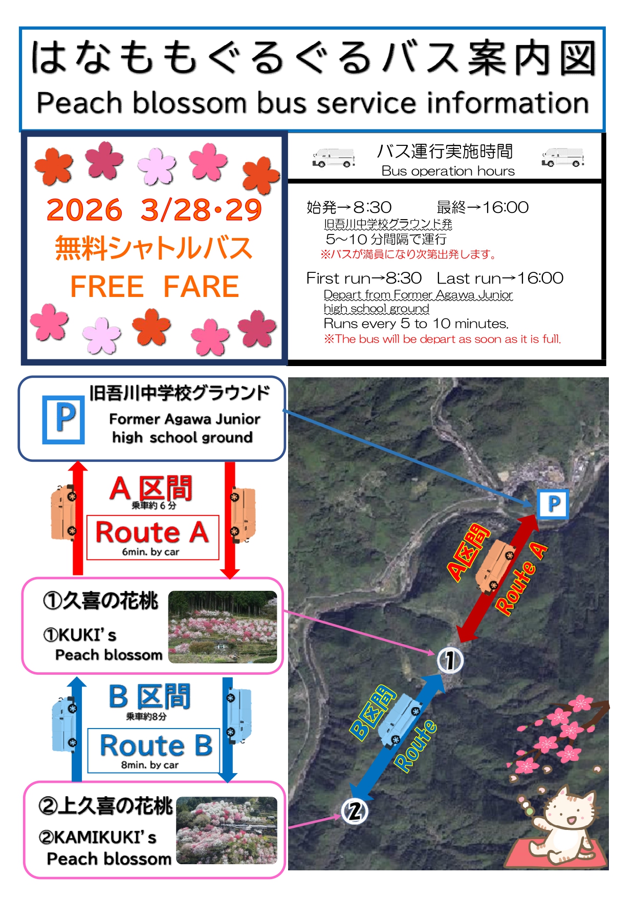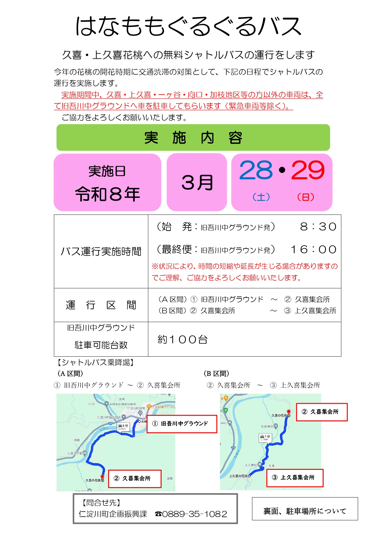 久喜・上久喜花桃への無料シャトルバスを旧吾川中学校より運行します。