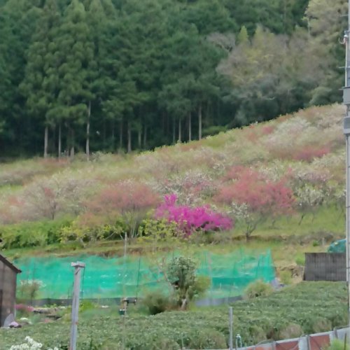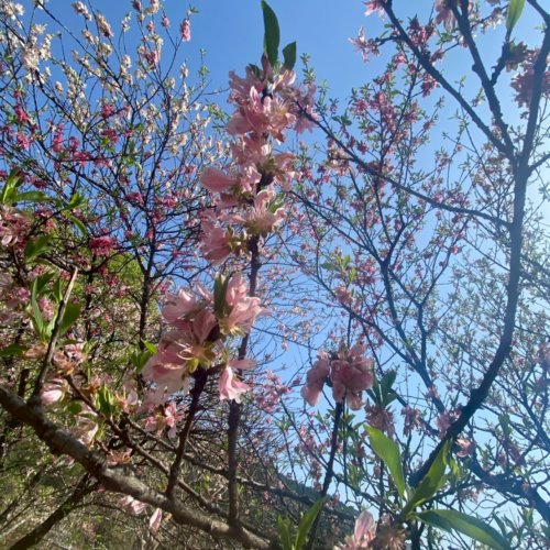 緑の斜面に赤・白・ピンクの花桃が色鮮やかに咲きます